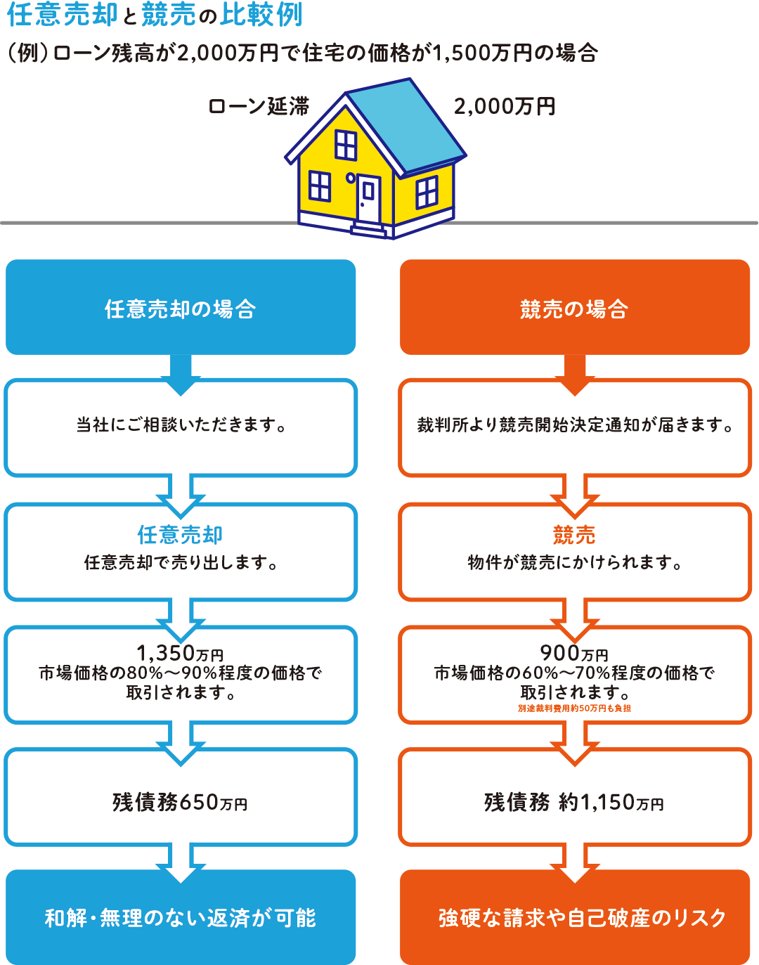 簡単にご説明すると、お客様の住宅ローン滞納の救済手段のことです。競売より少しでも有利な条件で売却できるように債権者(金融機関等)の承諾を得て住宅を売却する方法になります。信玄では任意売却での仲介手数料は50%引きです。※法定上限額からの割引率